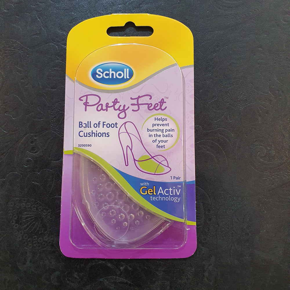 Scholl Party Feet® Ball of Foot Cushions are an ultra slim invisible gel cushion with adhesive technology, made thinner for comfort and help reduce the burning feeling in the balls of your feet & provide superior cushioning.
