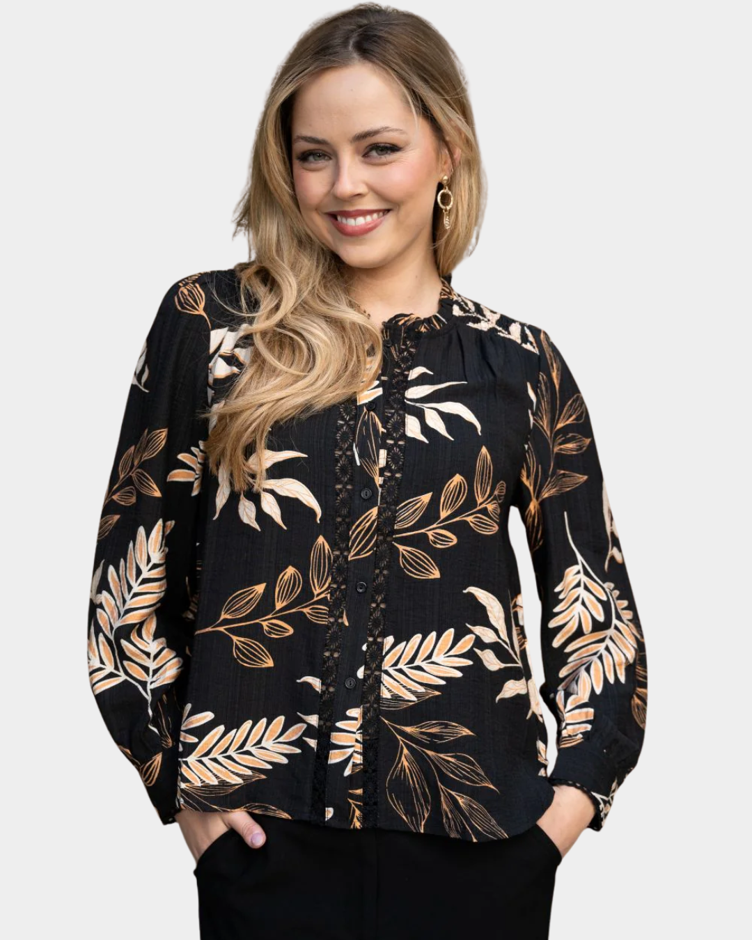 Elevate your everyday wardrobe with the Fria Leaf Print Blouse in classic black. This versatile piece features an elegant leaf print design that adds visual interest while maintaining a sophisticated, understated aesthetic. Perfect for layering or wearing solo, the blouse transitions seamlessly from office to weekend wear. The thoughtful print detailing brings dimension to your look without overwhelming your personal style.