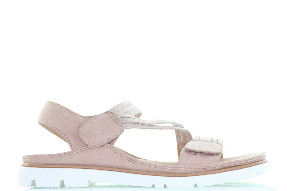 This sandal has a sleek, modern design featuring an upper with adjustable velcro straps for a secure fit. The straps appear to be made of a durable fabric, with a textured pattern that adds a subtle contrast. The sole is thick and white with deep treads, providing traction and comfort for long walks. The sandal also includes cushioning, ensuring a comfortable experience, while the lightweight construction makes it versatile for both casual and active use. Ideal for warm weather and outdoor activities.
