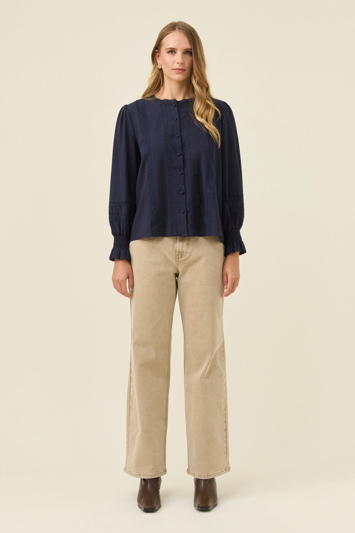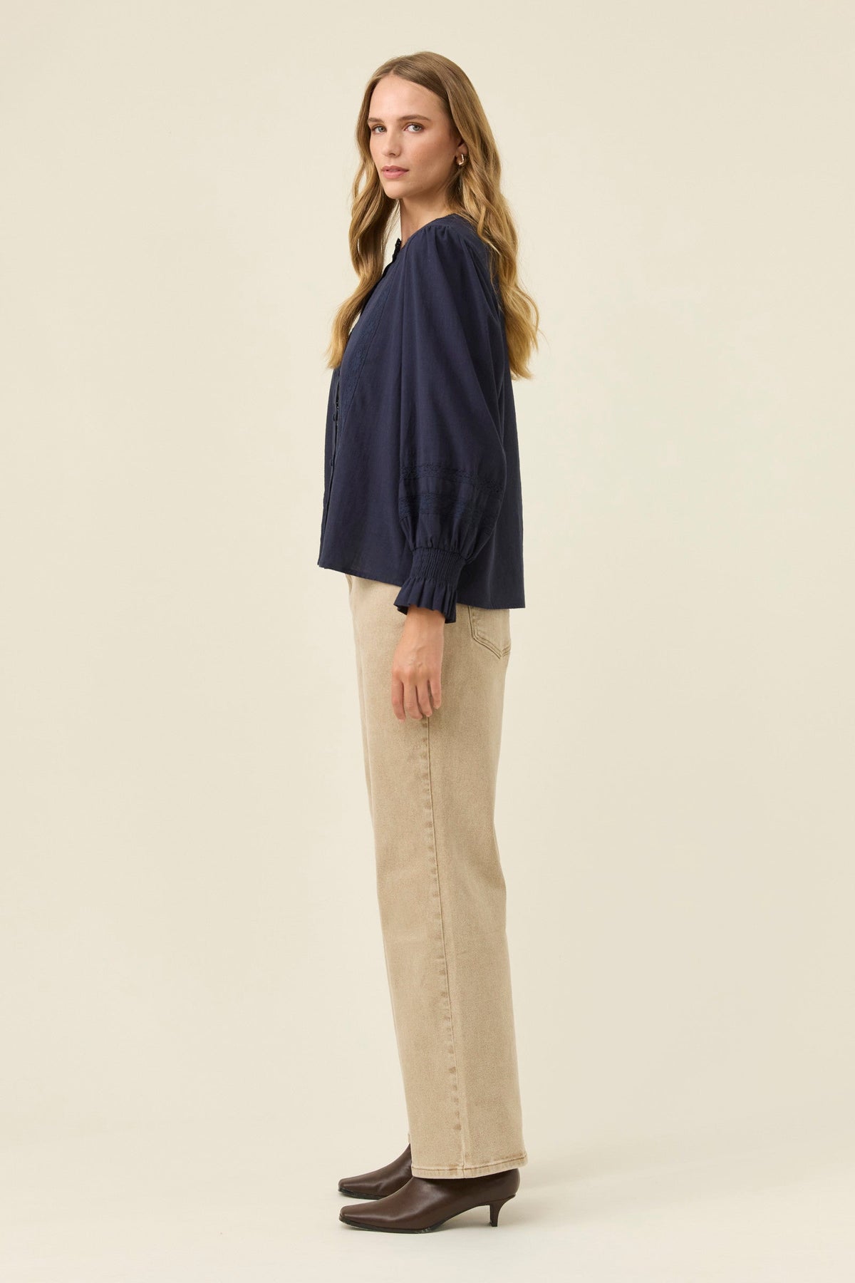 A feminine, lightweight cotton shirt with thoughtful detail, the Maeve Shirt blends soft structure with delicate lace accents. The band collar and lace inserts create a refined texture, complemented by full sleeves that gather at the shirred cuffs for gentle volume.